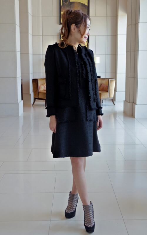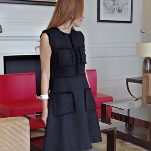 ツイード生地を生かし襟元、袖口、前たて、ポケットにフリンジを施してます。